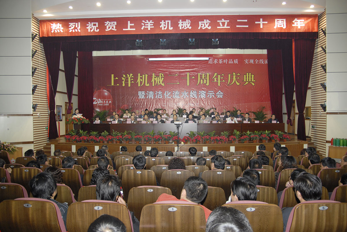 2008年,企業(yè)喜遷辦公大樓,上洋二十周年慶典隆重召開,來自社會各界領導及茶界專家、客戶共600余人參會。企業(yè)以“使清潔化更清潔,讓流水線流起來”為理念,引導茶加工產(chǎn)業(yè)發(fā)展新潮流,標志著公司在發(fā)展進程中邁出新的一步。