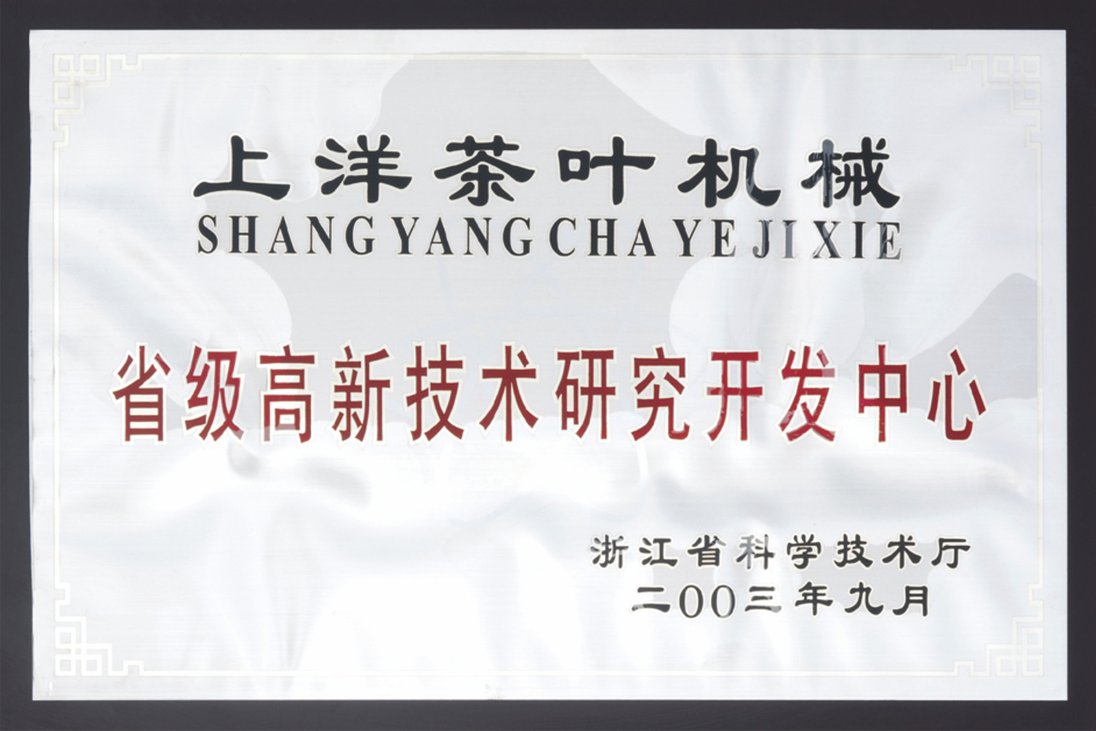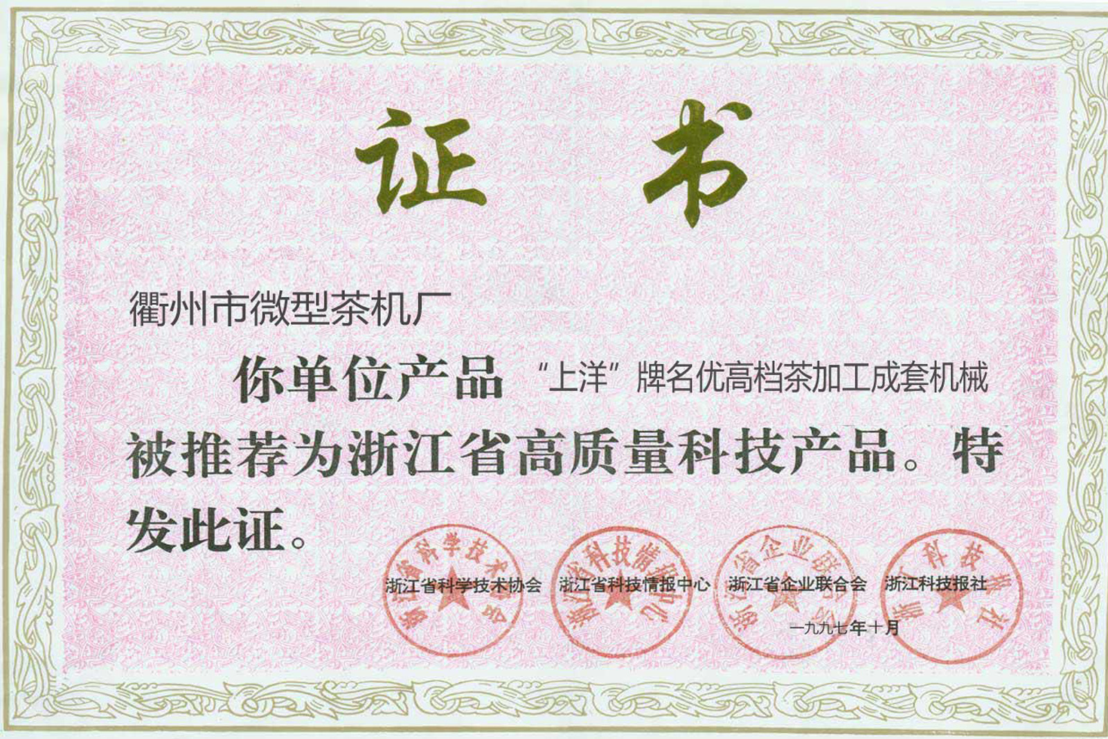 1997年10月,“上洋”牌名優(yōu)高檔茶加工成套機械被評為浙江省高質(zhì)量科技產(chǎn)品。