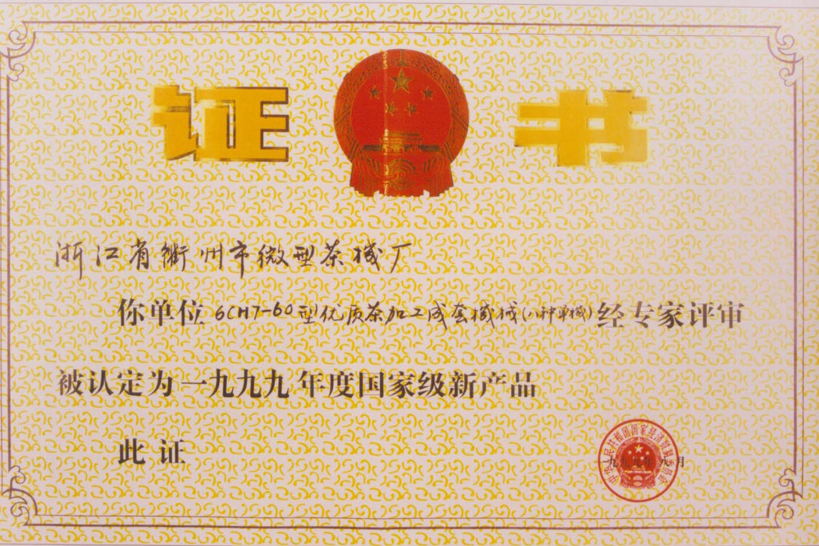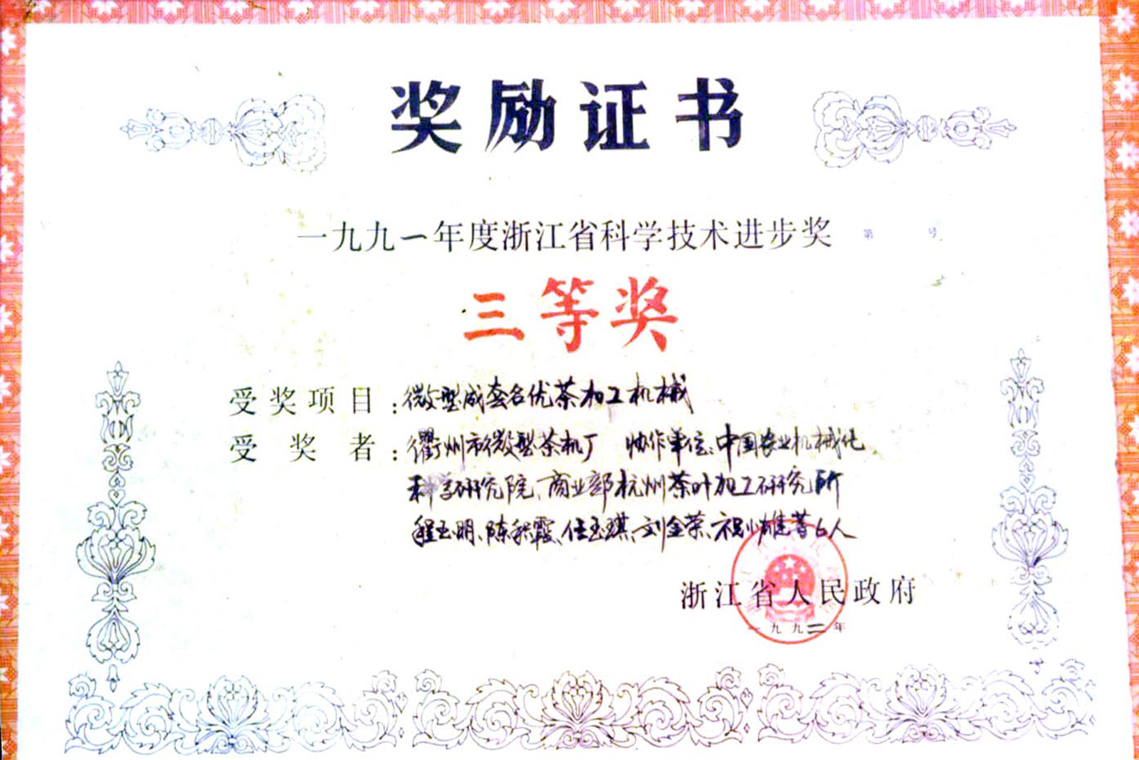 1991年,微型成套名優(yōu)茶加工機械通過省級新產(chǎn)品鑒定,這是國內(nèi)最早通過省級鑒定的茶機產(chǎn)品,同年該產(chǎn)品分別榮獲浙江省科技進步三等獎。