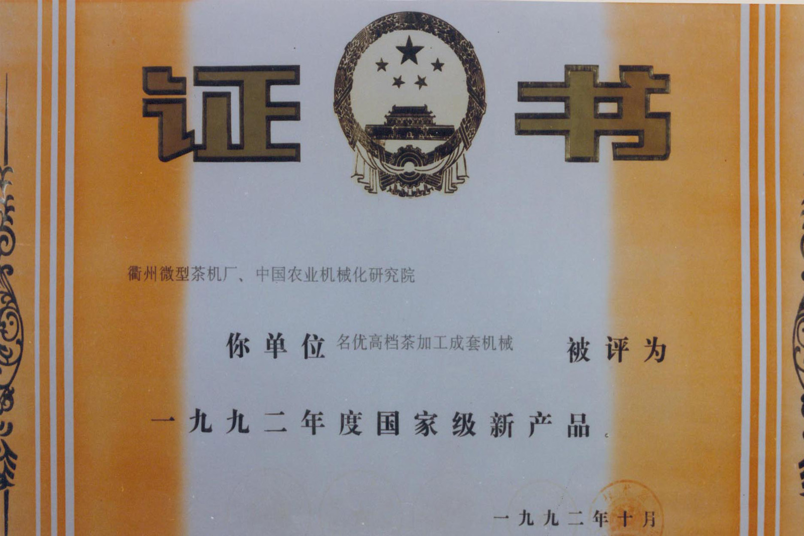 1992年10月,公司自主開發(fā)的“名優(yōu)高檔茶加工成套機械”通過國家級新產(chǎn)品鑒定,促進與推動了我國茶葉加工向機械化、效率化、商品化方向發(fā)展。