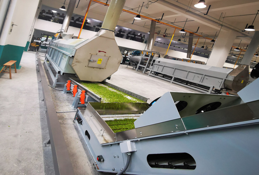 作業(yè)原理:機(jī)組利用高溫?zé)犸L(fēng)和茶鮮葉在熱風(fēng)滾筒內(nèi)全方位充分接觸,迅速鈍化活性酶,實(shí)現(xiàn)殺青速度快、透、勻,保證鮮葉色澤翠綠、鮮嫩,并促進(jìn)茶葉香型轉(zhuǎn)化。